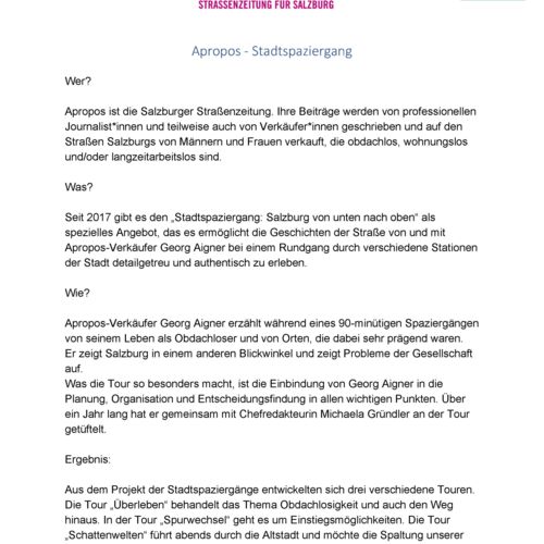 Seit Dezember 1997 gibt es die Salzburger Straßenzeitung zu lesen. 20 Jahre später können die Geschichten der Straße auch gehört und gesehen werden, denn seit September 2017 nimmt Apropos-Verkäufer Georg Aigner Interessierte mit auf eine Überlebens-Reise durch die Stadt Salzburg. Detailgetreu und authentisch erzählt er 90 Minuten aus seinem Leben und welche Rolle die einzelnen Stationen dabei spielen. Beim aktuellen Rundgang „Überleben“ steht der Salzburger Hauptbahnhof im Mittelpunkt. Der Bahnhof ist nicht nur eine Drehscheibe für Reisende und Pendler, sondern auch für Wohnungs- und Obdachlose. Bei dieser Tour erfahren Interessierte, wo arme Menschen übernachten, wie sie an Geld kommen, wo sie günstig Lebensmittel einkaufen und wie es sich anfühlt, täglich ums Überleben zu kämpfen. Was die Salzburger Tour so besonders macht: Die Einbindung von Verkäufer und Aproposstadtspaziergänger Georg Aigner von Beginn an bei der Konzeption, Planung, Organisation und Entscheidungsfindung in allen wichtigen Punkten.