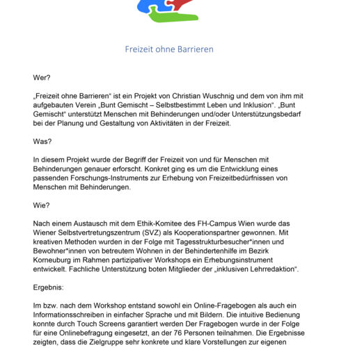 Das Projekt setzte sich mit dem vielfältigen Begriff der Freizeit und deren Bedeutung im Leben auseinander. Ziel war die partizipative Erstellung eines Forschungsinstruments zur Erhebung der Freizeitinteressen, Freizeithindernisse und des Unterstützungsbedarfs in der Freizeit von Menschen mit Behinderungen. Die Freizeitforschung weist darauf hin, dass der Raum der Freizeit ein besonders wertvoller Lern- und Erfahrungsraum ist und hinsichtlich der Entwicklungsmöglichkeiten eines Individuums essentiell ist. Es ist daher unbedingt dafür Sorge zu tragen, dass Menschen, die bei ihrer Freizeit Unterstützung benötigen, diese in angemessener Form erhalten. Insbesondere “Unterstützungsdienstleister” von bzw. für Menschen mit Behinderungen müssen wissen, wo die Bedürfnisse/Interessen und der Unterstützungsbedarf ihrer Klient*innen liegen. Mittels kreativen Methodeneinsatzes wurde engmaschig mit Betroffenen und mehreren Organisationen von und für Menschen mit Behinderungen zusammengearbeitet. Gemeinsam entstand ein umfassendes sowie möglichst barrierefreies und wandelbares Erhebungsinstrument. Die Erkenntnisse tragen zur nachhaltigen Verbesserung von Unterstützungsangeboten bei und werden nun auch von anderen Organisationen adaptiert.