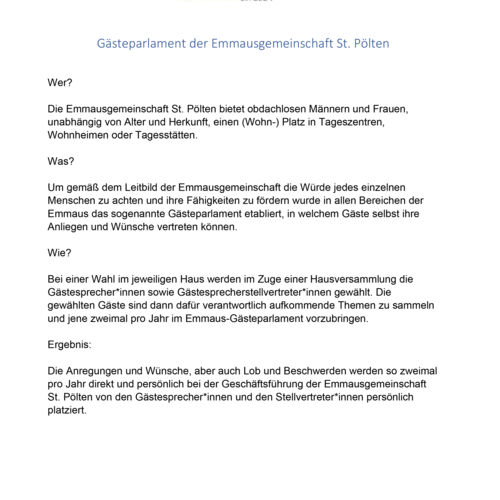 Das Projekt Emmaus - Gästeparlament wurde im Jahr 2021 von Johannes Simetsberger (Stabstelle Struktur & Entwicklung) gemeinsam mit den Bereichsleiter*innen aus der Behinderten- und Sozialhilfe ins Leben gerufen. Während im Bereich der Behindertenhilfe Gästesprecher*innen gesetzlich verankert sind, ist das im Bereich der Sozialhilfe nicht so. In den verschiedenen Wohn- und Arbeitsbereichen der Emmausgemeinschaft St. Pölten sind beide Bereiche vertreten, weshalb die Gäste aus der Sozialhilfe den Wunsch geäussert haben, ebenfalls GästesprecherInnen zu stellen. Daraus entstand die Idee des Emmaus-Gästeparlaments, um die Anliegen sichtbar werden zu lassen. Die Gästesprecher*Innen sowie Gästesprecher*innen-Stv. werden in den jeweiligen Häusern im Zuge einer Hausversammlung selbst gewählt. Die Gästesprecher*innen sind dann für die Sammlung der Themen verantwortlich und bringen diese zweimal pro Jahr dem Emmaus - Gästeparlament vor. Gemäß dem Leitbild der Emmausgemeinschaft St. Pölten wird mit dem Emmaus - Gästeparlament ein Werkzeug für unsere Gäste geschaffen, das zusätzlich dazu beiträgt die Würde jedes einzelnen Menschen zu achten und ihre Fähigkeiten zu fördern. Die Anregungen und Wünsche, aber auch das Lob unserer Gäste werden so zweimal jährlich direkt und persönlich bei der Geschäftsführung der Emmausgemeinschaft St. Pölten platziert.