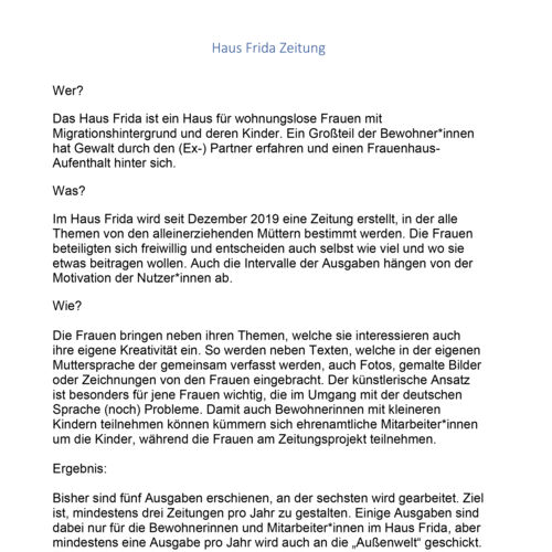 Im Rahmen der Partizipation im Caritas Haus Frida, wurde das Projekt „Haus Frida Zeitung“ ins Leben gerufen. Die Haus Frida Zeitung zeichnet sich vor allem dadurch aus, dass alle Themen von den alleinerziehenden Müttern, die von Obdachlosigkeit und Gewalt betroffen waren, bestimmt werden. Sie können so herausfinden, wo ihre Interessen liegen, werden auch ermutigt ihre Ideen kundzutun sowie für ihre Meinungen einzustehen und sich selbstwirksam zu erleben. Durch den kreativen Ansatz ist es gelungen auch Frauen einzubeziehen, die sich in der deutschen Sprache (noch) nicht gut ausdrücken können. Fotos, gemalte Bilder, Zeichnungen, Texte in der Muttersprache oder gemeinsam verfasste Texte sind nur einige Beispiele dafür. Somit hat sich die Zeitung mittlerweile zu einem wichtigen Kommunikationsinstrument nicht nur unter den Bewohnerinnen, sondern auch zwischen Bewohnerinnen und Team/Leitung im Haus Frida entwickelt und fördert das Gemeinschaftsgefühl im Haus. Allen voran zielt die Partizipation in der Herausgabe der Haus Frida Zeitung darauf ab, die Selbstwirksamkeitserwartung der Nutzerinnen zu steigern.