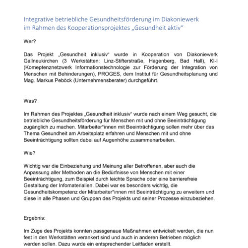 Ziel des Projekts war es, Betriebliche Gesundheitsförderung in einem inklusiven Setting (3 Werkstätten für Menschen mit Beeinträchtigung) für alle Personen mit und ohne Beeinträchtigung gleichermaßen möglich und zugänglich zu machen. Das Diakoniewerk hat diese Ziele im Rahmen des Kooperationsprojektes „Gesundheit inklusiv“ erarbeitet.