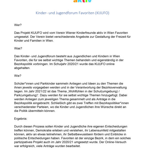 Das Kinder- und Jugend Forum besteht aus Schüler*innen und Parkkindern Favoritens mit dem Ziel, Anliegen und Ideen vorher genannter Kinder/Jugendlicher mittels Anträgen an die Bezirkspolitik zu stellen. Es werden für die möglichen teilnehmenden Kinder/Jugendgruppen „Themen“ vorgegeben (2019/20 das Thema Sauberkeit, 2020/21 das Thema Verkehrssicherheit und 2021/22 das Thema Wohlfühlen in der Schul(umgebung)/Park(umgebung)) die im Rahmen der Bezirkskompetenzen liegen. Weiteres werden auftauchende und offene Themen von Schüler*innen als potenzielle Themenschwerpunkte hinzugefügt und an die Bezirksvorstehung weitergeleitet. Sofern diese durch den Bezirk bearbeitet werden können, werden diese gerne aufgegriffen. Auf Grund der Corona-Krise und der damit einhergehenden Lockdowns wurde auf Wunsch der Kinder/Jugendlichen gemeinsam beschlossen auf ihre Bedürfnisse im Zusammenhang mit der neuen Situation einzugehen, sodass sie im Zusammenhang mit Distance-Learning /Corona/Lockdown Anträge an den Bezirk stellen konnten. Das besondere im Schuljahr 2020/21 war, dass das KIJUFO online abgehalten wurde. Die Kinderfreunde aktiv und der Bezirk haben relativ spontan auf die Lockdowns reagiert und einen neuen zu der Zeit wieweit einzigartigen Versuch gestartet. Das Ergebnis kann sich sehen lassen, weil viele Anträge erfolgreich bearbeitet werden konnten und Favoriten der einzige Bezirk ist, in dem in diesem Schuljahr solch ein partizipatives Projekt umgesetzt wurde. Alle anderen Bezirks-Kinder/JugendParlamente wurden nicht umgesetzt.