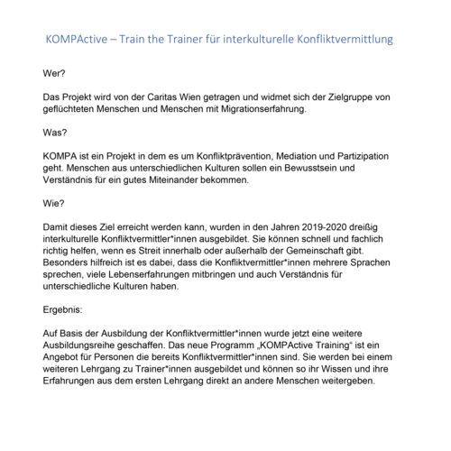 Das 2015 ins Leben gerufene Projekt KOMPA steht für Konfliktprävention, Mediation und Partizipation. In den ersten Jahren bot Kompa sowohl für neu angekommene wie auch für bereits länger hier lebende Menschen in Wien und Niederösterreich ein breites Spektrum an Angeboten zur Bewusstseinsbildung um Verständnis füreinander zu entwickeln, an. In den Jahren 2019-2020 wurden bei KompaLOG dreißig interkulturelle Konfliktvermittler*innen in zwei Basislehrgängen ausgebildet und begleitet. Konfliktvermittler*innen sind Personen, die für den Umgang mit Auseinandersetzungen ausgebildet werden. Sie können schnell und kompetent in und außerhalb von ihren Gemeinschaften helfen, wenn es Streit gibt. Besonders zeichnen sich die Konfliktvermittler*innen durch ihre interkulturelle Kompetenz, ihre Mehrsprachigkeit und die diversen Lebenserfahrungen aus. Das Angebot richtet sich speziell an Menschen mit Migrationsbiographie. Inhalte, die an gängigen Instituten hochschwellig und akademisiert vermittelt werden, werden in diesem Programm zugänglich und in einfacher Sprache aufbereitet. Das aktuelle Angebot von Kompa heißt „KOMPActive-Training“- ein Train the Trainer Programm für interkulturelle Konfliktvermittler*innen. Dabei werden Alumnis vom Basislehrgang weiter zu Trainer*innen ausgebildet, um ihr Wissen, ihre Erfahrungen und ihr Know How direkt an Menschen in ihren Communities weitergeben können.