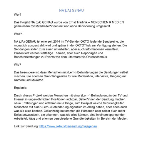 NA (JA) GENAU ist eine inklusive TV Sendung, welche monatlich auf OKTO TV ausgestrahlt wird (je 27min.) und anschließend online in der OKTOthek und auf YouTube abrufbar ist. Die Moderator*innen und Reporter*nnen sind Menschen mit (Lern-) Behinderungen. Das TV Format ist eine Mischung aus Unterhaltungs- und Informationssendung. Es werden nicht nur Themen rund um Menschen mit (Lern-) Behinderungen präsentiert, sondern Themen und Menschen, die möglichst viele Zuseher*innen ansprechen, wie z.B. mit Studiogästen, wie die Boxerin und Dancing Star Teilnehmerin Nicole Wesner, die Buchautorin Doris Knecht oder der Kabarettist Hosea Ratschiller. Es werden aber auch Reportagen (einzelne Sendungsteile) bzw. ganze Sendungen gestaltet, die sich z.B. mit Literatur von Menschen mit Lernbehinderung beschäftigen (Literaturpreis Ohrenschmaus) oder z.B. der inklusive Kunstpreis VOI fesch, wo die Hauptpreisverleihung in Graz statt fand. Das heißt, Themen-, Veranstaltungen und Bereiche, welche sich zur Aufgabe machen, Menschen mit (Lern-) Behinderungen in den Vordergrund zu stellen, auch zu präsentieren. Über Social Media Kanäle wie Facebook und Co, sowie über persönliche Kontakte, über Verteiler von Kooperationspartner*innen wird per Mail Werbung gemacht bzw. neue Personen auf die Sendereihe aufmerksam gemacht. Auch durch die Kooperation mit dem Breitenseer Lichtspiele Kino wird weitere Öffentlichkeit erreicht. Ebenso gibt es im Kino Aufführungen der Sendungen (auf ca 20min gekürzt). Für die PR wird neben Ernst Tradinik weiterhin Natascha Toman zuständig sein. Natascha Toman studierte Bildungswissenschaften, ist Expert*in in UK (unterstützte Kommunikation) und selbst mehrfach körperlich behindert. Sie ist seit November 2020 im Team mit dabei. Die Sendereihe NA (JA) GENAU wurde 2021 für den „TV Preis der Erwachsenenbildung“ nominiert und erhielt in der Kategorie „Arbeit & Integration“ den NÖ Preis „Vorbild Barrierefreiheit 2021“.