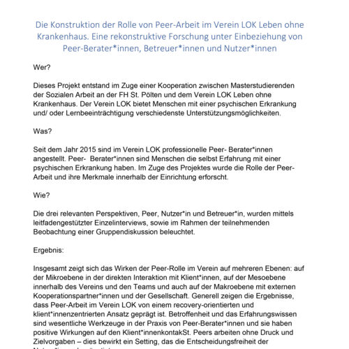 Die Konstruktion der Rolle von PeerArbeit im Verein LOK - Leben ohne Krankenhaus. Eine rekonstruktive Forschung unter Einbeziehung von Peer-Berater*innen, Betreuer*innen und Nutzer*innen.