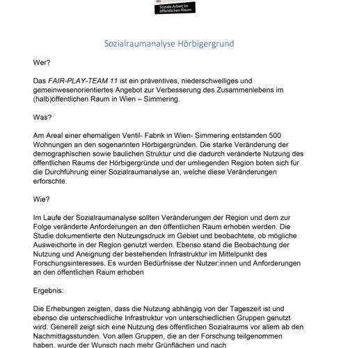 Im Zuge der Wiener Stadterweiterung werden ganze Gebiete neu geschaffen oder umgestaltet, so auch die Hörbigergründe in Wien-Simmering: am Areal einer ehemaligen Ventilfabrik entstanden 500 neue Wohnungen. Die starke Veränderung der demographischen sowie baulichen Struktur und die dadurch veränderte Nutzung des öffentlichen Raums der Hörbigergründe und der umliegenden Region boten sich für die Durchführung einer Sozialraumanalyse an, welche diese Veränderungen erforschte. Die Erhebungen wurden vom FAIR-PLAY-TEAM 11 (FPT11) bis Herbst 2019 durchgeführt. Die angewandten sozialräumlich orientierten Methoden umfassen Befragungen, Beobachtungen, Nadelmethode, subjektive Landkarte und Erhebung der Wegstrecken. Den Abschluss der Erhebungen machte ein Gruppeninterview. Ab 2020 wurden die Daten fortlaufend ausgewertet und 2021 publiziert. Ziel der Sozialraumanalyse war es, Veränderungen in der Region verstehen zu können und zu erforschen. Dabei stand die Beobachtung der Nutzung und Aneignung der bestehenden Infrastruktur im Mittelpunkt der Zielsetzung. Die Studie dokumentierte den Nutzungsdruck im Gebiet und beobachtete, ob und welche Ausweichorte genutzt wurden, um damit die Bedürfnisse der Nutzer*innen des öffentlichen Raums sichtbar zu machen.