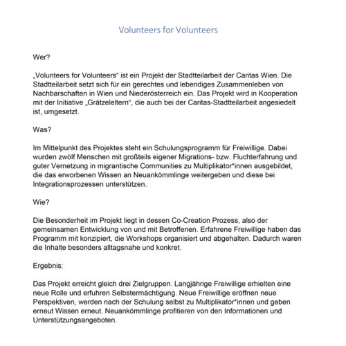 Das Projekt „Volunteers for Volunteers“ ist eine Pilot Action, die im Rahmen des Interreg Central Europe Projektes „SIforREF“ in Kooperation mit dem Projekt Grätzeleltern der Caritas Stadtteilarbeit umgesetzt wurde. Im Fokus des Projektes stand ein Schulungsprogramm für Freiwillige. Zwölf neue Freiwillige, die Großteils eigene Migrations- und/oder Fluchterfahrungen haben und in unterschiedlichen migrantischen Communities gut vernetzt sind, wurden zu Multiplikator*innen ausgebildet. Nach der Schulung engagieren sie sich in ihren Netzwerken und Communities. Sie geben das erworbene Wissen an Neuankömmlinge in Wien weiter und unterstützen bei Integrationsprozessen. Die Besonderheit bzw. das Innovative am Schulungsprogramm war ein Co-CreationProzess, der das Projekt über die gesamte Laufzeit bestimmte. So wurden erfahrene Freiwillige (wiederum Großteils mit eigener Migrations- und/oder Fluchterfahrung) aus dem Projekt Grätzeleltern der Caritas Stadtteilarbeit eingeladen, um gemeinsam das Schulungsprogramm zu konzipieren, Inhalte zu erarbeiten und schlussendlich auch einzelne Schulungsworkshops zu organisieren und abzuhalten. Durch diese methodische Herangehensweise waren die Schulungsinhalte besonders alltagsnahe, anknüpfungsfähig, leicht verständlich und konkret. Gleichzeitig erhielten erfahrene Freiwillige eine neue Rolle und erfuhren Selbstermächtigung.