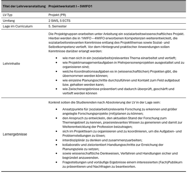 Im Curriculum des Bachelorstudiums Soziale Arbeit ist im dritten Studienjahr eine Projektwerkstatt vorgesehen. Die Projektthemen werden in Abstimmung mit den Forschungsschwerpunkten des Departments und mit Praktiker*innen der Sozialen Arbeit entwickelt. Projektvorschläge werden jeweils ab Herbst eines Jahres von den Leiter*innen der Forschungsschwerpunkte gesammelt.