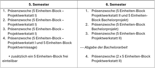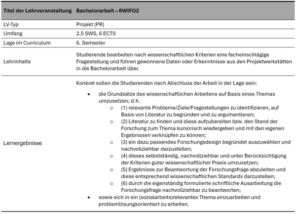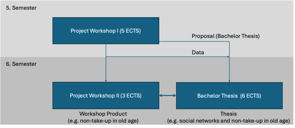 Im Winter- als auch im Sommersemester wird das Projekt von der Lehrveranstaltung Projektwerkstatt I und II begleitet und steht in enger Verbindung zur Bachelorarbeit (siehe Abbildung). Die Bachelorarbeit wird als eigener Kurs geführt, von den Projektleiter*innen der Projektwerkstatt betreut und ist thematisch mit der Projektwerkstatt verknüpft.