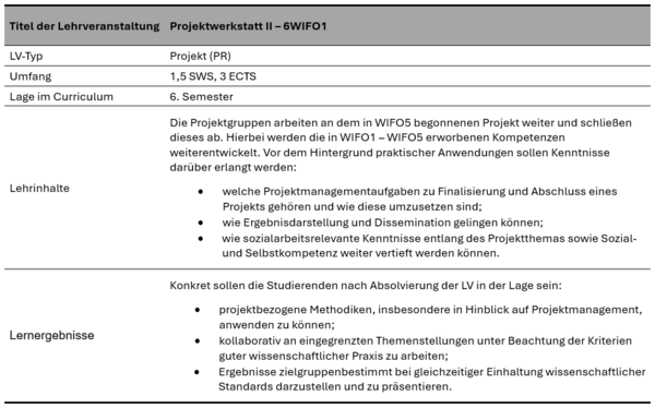 Die Studierenden der beiden Organisationsformen des Studiums wählen zwischen den Projekten eines Studienjahres, d.h. die Projektteilnehmer*innen setzen sich aus Vollzeit- und berufsbegleitenden Studierenden zusammen. Jeweils zumindest zwei Lehrende begleiten eine Gruppe von ca. 14 Studierenden bei der Umsetzung des Projektes und bei der Erstellung ihrer daraus resultierenden Bachelorarbeit. Die Projektwerkstatt ist Teil der wissenschaftlichen Ausbildung der Studierenden: Kompetenzen in der Projektorganisation, im Einsatz wissenschaftlicher Forschungsmethoden, im Verfassen wissenschaftlicher Publikationen und sonstiger Produkte werden vermittelt.