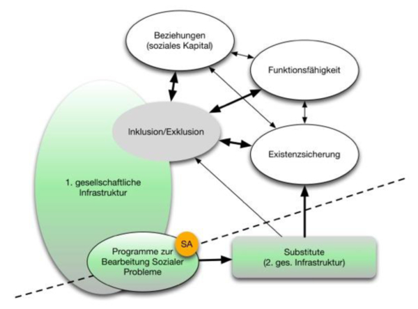 Abbildung 3 skizziert den Ort der Sozialarbeit in einem Setting von Individuum und Gesellschaft. Die basalen Komponenten der Lebensführung von Personen in heutigen Gesellschaften sind ihre Funktionsfähigkeit (inwieweit machen sie ihre physischen und psychischen Bedingungen handlungsfähig), der Grad ihrer Existenzsicherung (sind sie mit all dem versorgt, was sie zu ihrer Lebensführung brauchen) und das Set ihrer Beziehungen zu anderen Personen (soziales Kapital im Sinne von Pierre Bourdieu). Für ihre Lebensführung müssen sie wegen der weit entwickelten gesellschaftlichen Arbeitsteilung auf die gesellschaftliche Infrastruktur zurückgreifen. Die Möglichkeit dieses Zugriffs kann man als Inklusion/Exklusion beschreiben. Im Normal- und Idealfall stehen Personen ausreichende Teilhabemöglichkeiten zur Verfügung und sie können z.B. über Erwerbsarbeit am Prozess des Austauschs und der Arbeitsteilung teilnehmen und so die für ihre Lebensführung nötigen Ressourcen akquirieren. Die zweite Schicht gesellschaftlicher Infrastruktur bietet Substitute, wenn über Teilhabe / Inklusion Lebenssicherung nicht gelingt – für dieses Feld kann man von „stellvertretender Inklusion“ sprechen (Baecker 1994:102f). Seine Funktion „erfüllt das System der Sozialhilfe aber nur dann, wenn es die stellvertretende Inklusion, die es bewerkstelligt, in Inklusion überführen kann, die gerade nicht von ihm, sondern von den anderen Funktionssystemen der Gesellschaft erfüllt werden kann“ (ebd.:103).