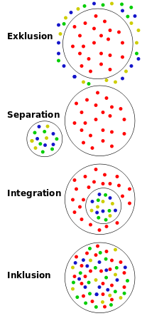 Abb. 1: Formen des Zusammenlebens zwischen unterschiedlichen Gruppen in einer Gesellschaft/unterschiedlichen Mitgliedern in einer Gruppe. (Quelle: http://commons.wikimedia.org/wiki/File:Stufen_Schulischer_Integration.svg)